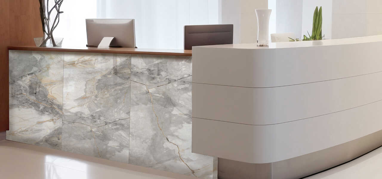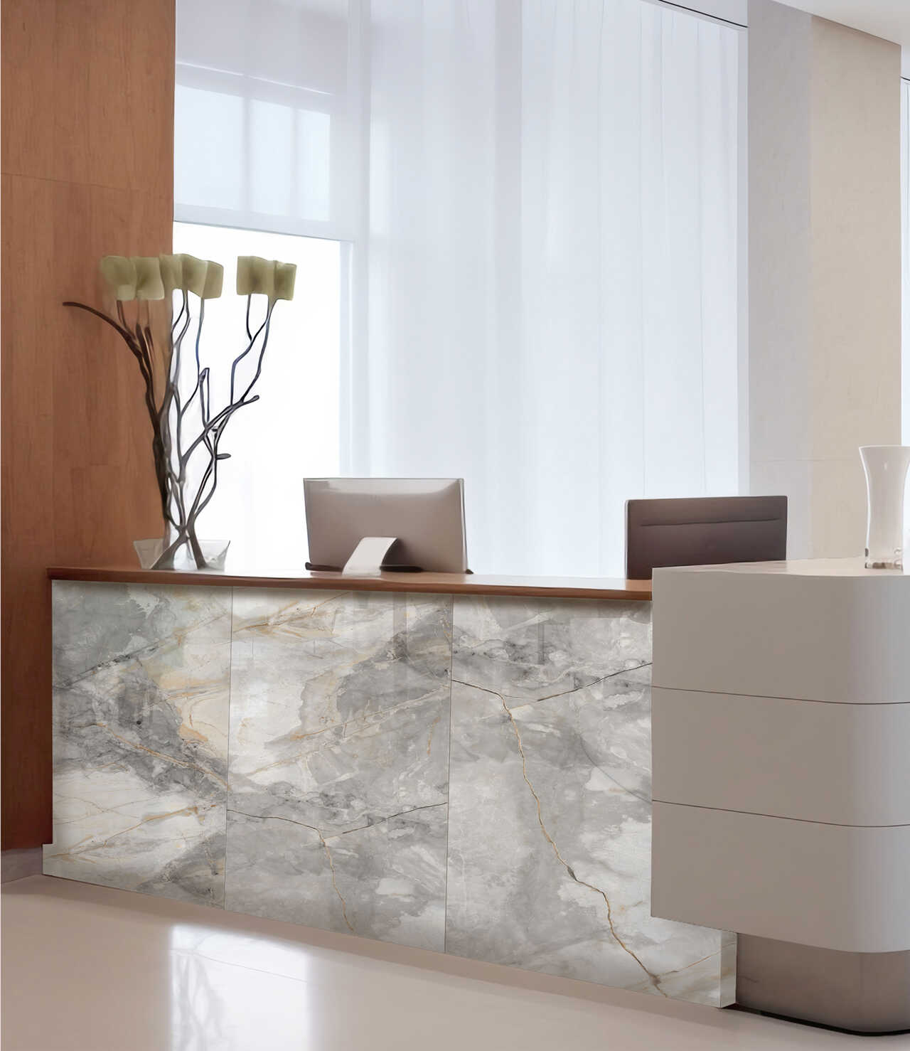 일일히 관리 해야하는 대리석의 번거로움을 없애고 유리특유의 광택감과 UV프린팅으로 인쇄한 천연 대리석 패턴의 고급스러움이 어우러져 세련되고 현대적인 인테리어에 적합한 자재입니다